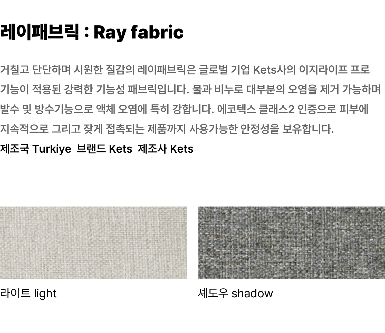 독일산 Gutermann 에코텍스 클래스1 폴리에스터 실, 일본산 Ykk 프리미엄 지퍼 국내산 30-40Kg/m³ 초고탄성 폴리우레탄폼, 이탈리아산 Frabo 수성접착제, 스위스 Huvis의 폴리에스터 패딩솜과 향균처리된 마이크로파이버 자연건조된 미국산 서든옐로우파인과 스프러스목, 이탈리아 INETS 천연고무 밴드, 국내산 E0 베니어판